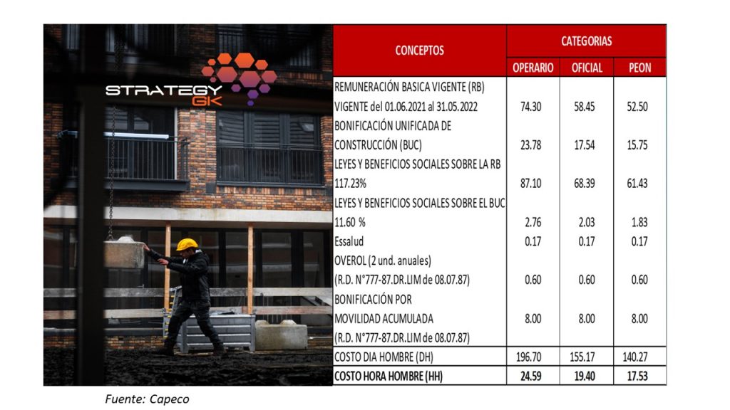 De esta manera, los nuevos jornales básicos para el operario son de S/ 74.30, para el oficial de S/ 58.45 y el peón de S/ 52.50 por ocho horas de labor, que regirán a nivel nacional hasta el 31 de mayo de 2022.